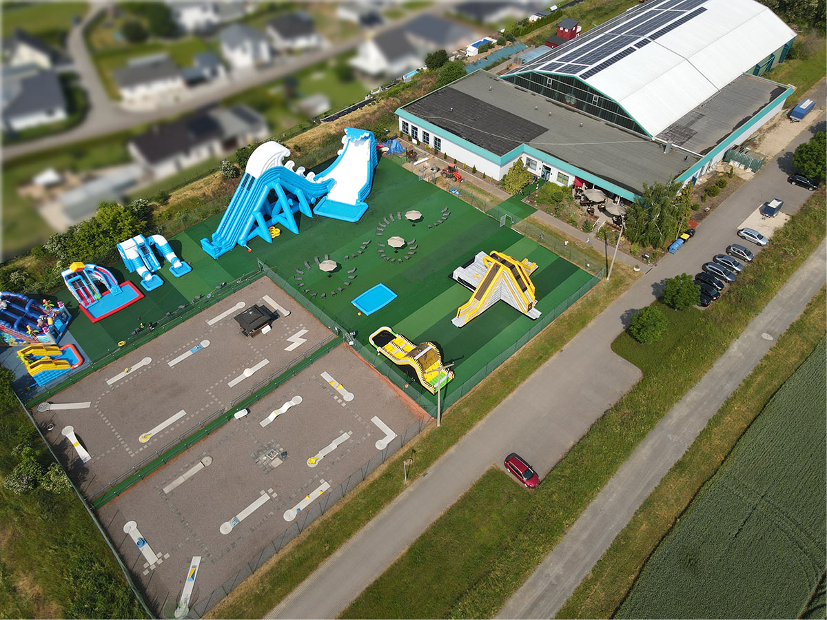 Wasserpark mit Hüpfburgen, Reifenrutsche, Wasserrutschen, Pool, Sprungturm und Sonnenliegen